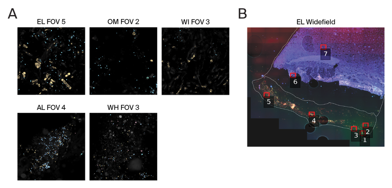 Figure 4. Example fields of view (FOVs) for each of the five cheeses (A) and an example corresponding widefield image for EL with FOVs mapped on the image (B).