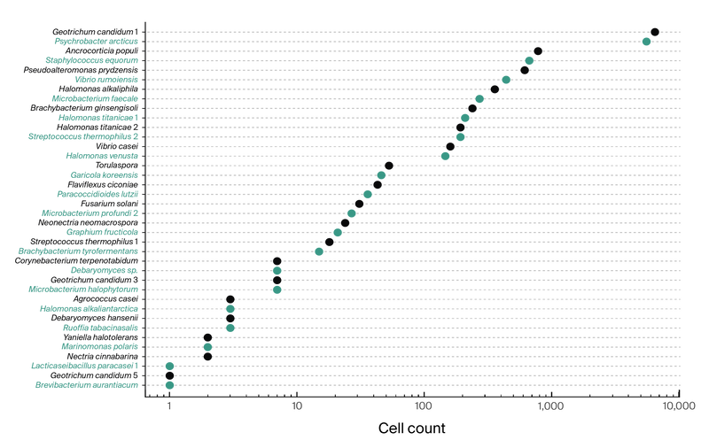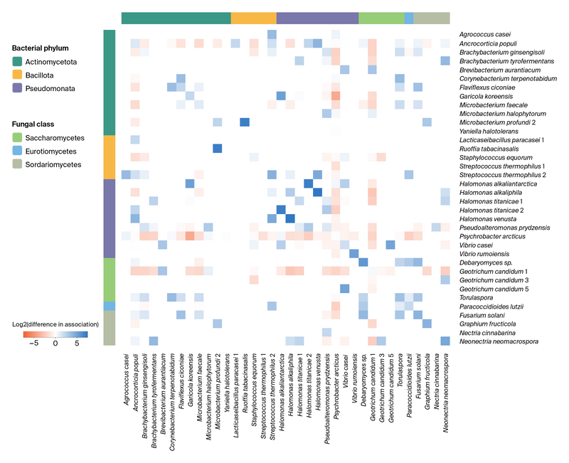 Kanvas Biosciences also performed correlation analysis to look for consistent positive or negative associations between microbes (Figure 5). They then did taxa enrichment analysis, on a per-cheese basis and across the whole dataset, to compare these spatial associations of microbes to what might be observed by chance. However, only one negative association was significant (Geotrichum candidum 1 and Ancrocorticia populi). This is likely to be a false positive rather than a true indication of microbial interaction, as these species do not often exist in the same images or at similar concentrations in those images.