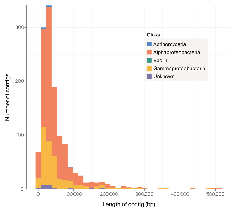 Color corresponds to the class of bacteria that we taxonomically identified for that contig.