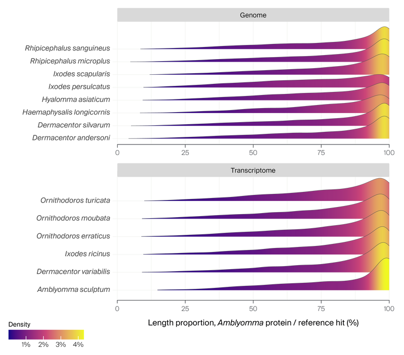 Plots are separated by whether the proteins for the reference tick species were obtained directly from the genome or predicted from the assembled transcriptome of the species. Length proportion is calculated by the length of the source A. americanum protein divided by the length of the corresponding hit protein in that tick species. Color corresponds to the density of proteins with the calculated length proportion.