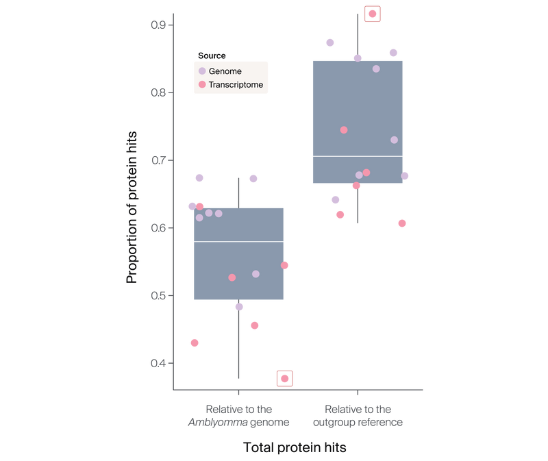 We then compared proteins from A. americanum to aligned proteins in the other tick species with pairwise diamond blastp comparisons. We calculated both the proportion of proteins from other tick species that had hits in the A. americanum proteome relative to the total number of predicted A. americanum proteins. The proportion of proteins from other tick species with hits relative to the total number of proteins from that tick species’ proteome (Figure 3). For example, we predicted proteins from the tick Amblyomma sculptum based on a transcriptome assembly, and this was one of the least complete proteomes in our reference set (we’ve highlighted the A. sculptum points with red squares in Figure 3).