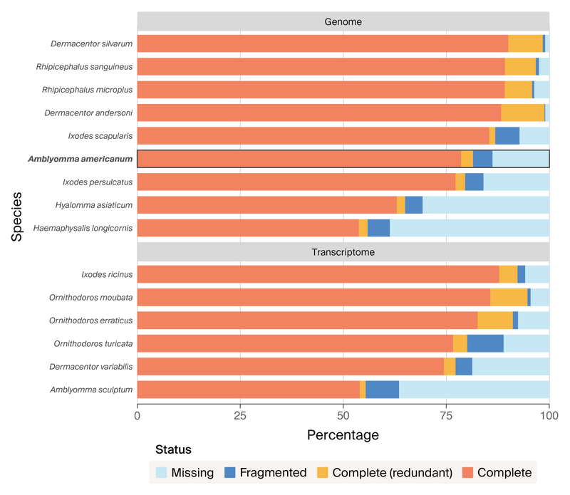Figure 2. BUSCO scores for filtered tick proteomes compared to the filtered Amblyomma americanum proteome using the arachnida_odb10 lineage.