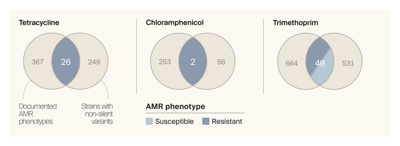 Intersections of strains with non-silent variants in antibiotic resistance contigs and available AMR phenotypes. Each Venn diagram shows the intersections of strains that have identified non-silent variants in resistance genes of the indicated antibiotic (chloramphenicol, trimethoprim, or tetracycline) and corresponding AMR phenotypes. The color of the intersection indicates the AMR phenotypes observed for these strains (pale blue: susceptible, darker blue: resistant).