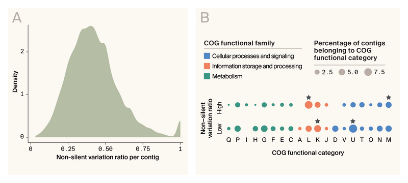 (B) Distribution of COG functional categories among the contigs associated with high (> 90% non-silent mutations in a contig — 316 contigs) or low (< 10% of non-silent mutations in a contig — 117 contigs) non-silent variant rates. “Percentage” indicates the percentage of CDS in each dataset associated with the COG functional category. Stars identify the two COG functional categories (discussed in the text) that were the most represented among the contigs with high or low levels of non-silent polymorphisms. COG categories: A: RNA processing and modification; C: Energy production and conversion; D: Cell cycle control and mitosis; E: Amino acid metabolism and transport; F: Nucleotide metabolism and transport; G: Carbohydrate metabolism and transport; H: Coenzyme metabolism; I: Lipid metabolism; J: Translation; K: Transcription; L: Replication and repair; M: Cell wall/membrane/envelope biogenesis; N: Cell motility; O: Post-translational modification, protein turnover, chaperone functions; P: Inorganic ion transport and metabolism; Q: Secondary structure; S: Function unknown; T: Signal transduction; U: Intracellular trafficking and secretion; V: Defense mechanisms.