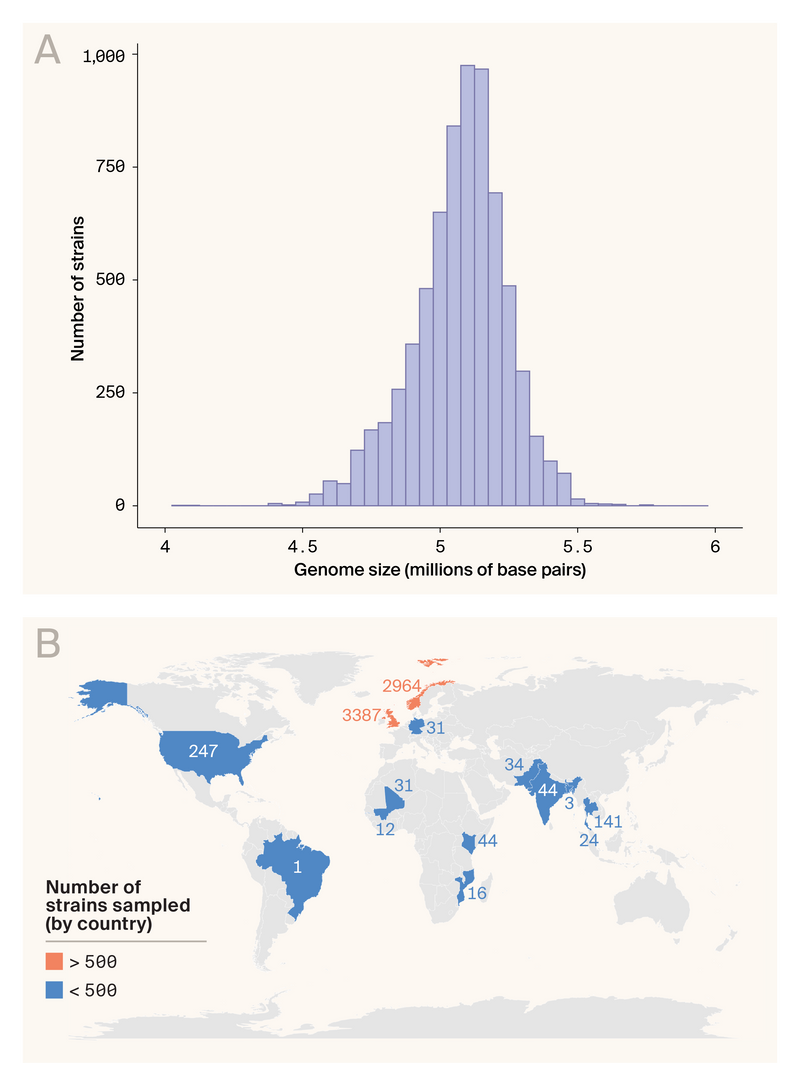 Figure 1. The worldwide isolated strains in our cohort span the expected genome size range for E. coli.
