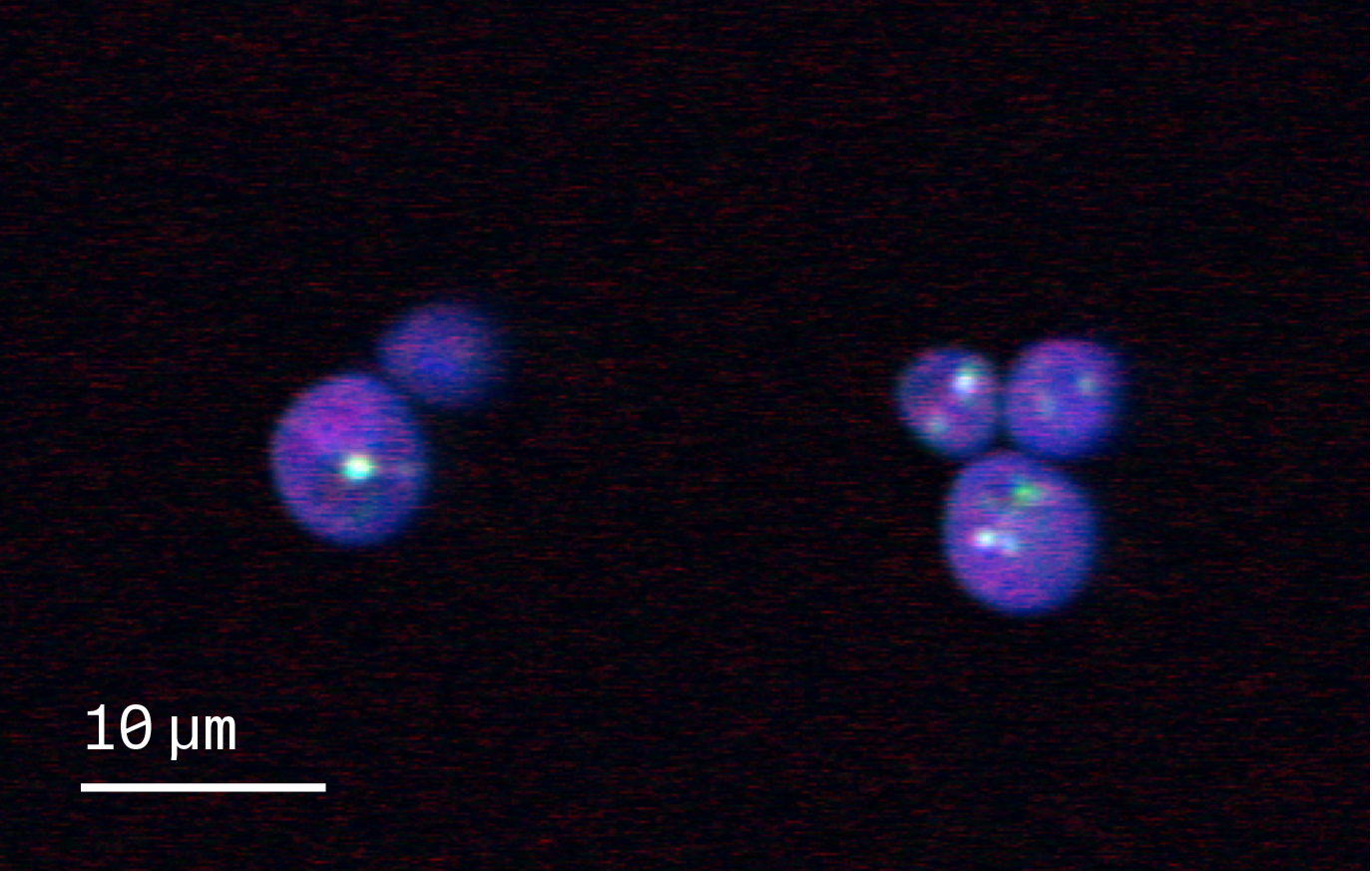 We grew three haploid S. cerevisiae strains — BY4741, YNL141w (aah1∆ mutant), and YGL058 (rad6∆ mutant) — in YPD media at 30 °C and 200 rpm overnight until saturation. For each sample, we pipetted 3 μL of dense cells onto a #1.5 coverslip clean glass slide, within a 4 mm wax circle. We flipped the coverslip onto an ethanol-cleaned glass slide and sealed it with VALAP (1:1:1 vaseline, lanolin, paraffin). We immediately imaged the cells.