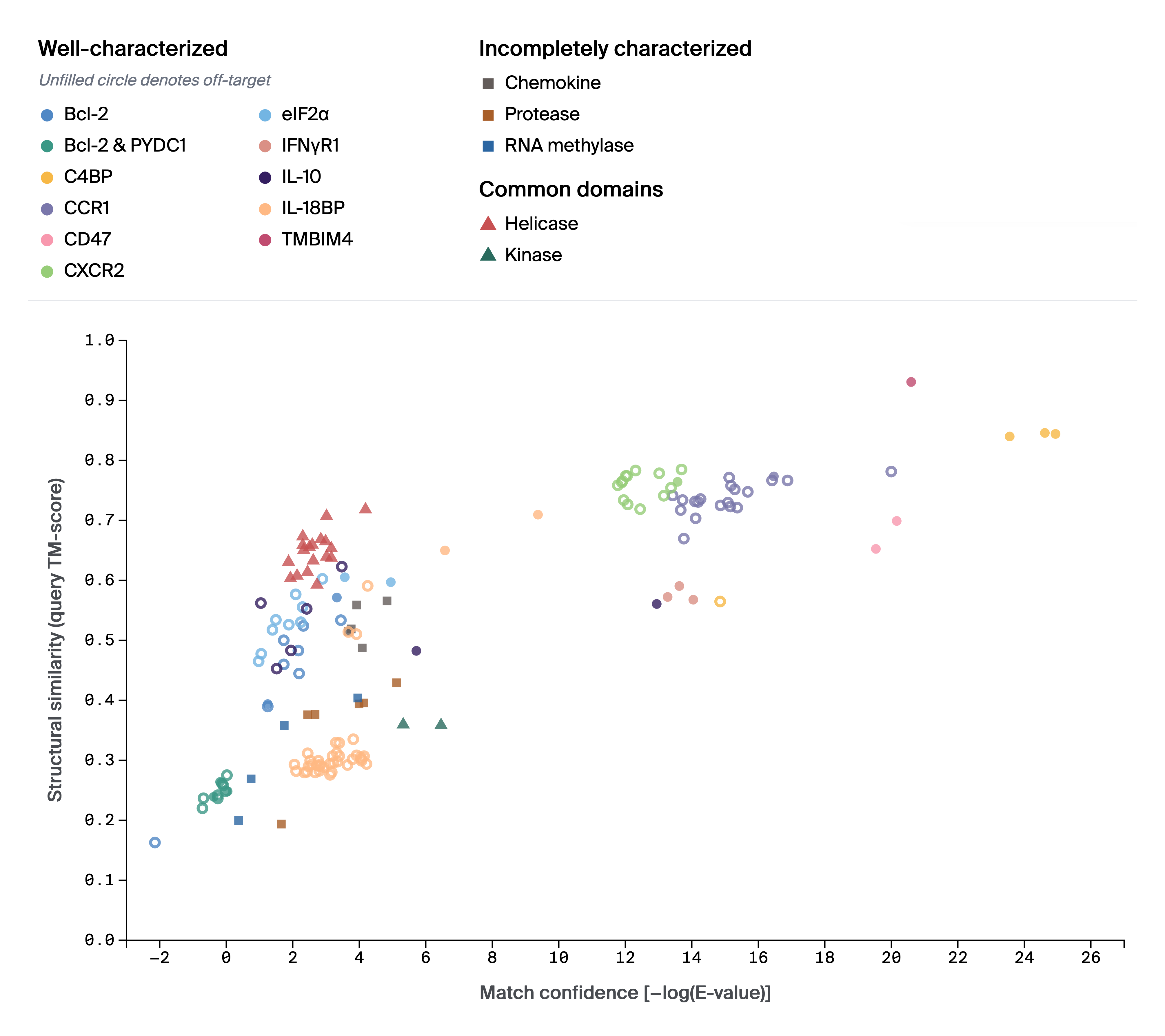Our results: We queried with two eIF2α mimics from two poxviruses, each protein in a separate Viro3D cluster. The vaccinia virus protein encoded by VACWR034 matched to eIF2α alone. However, the yaba monkey tumor virus protein 12L matched against eIF2α as well as nine off-target matches. Most of these off-target matches are to other members of the nucleic-acid-binding proteins superfamily (SRBD1, PDCD11, EXOSC3, PNPT1, DIS3, ZCCHC17, EXOSC1). However, two off-target matches are outside of that family: DNA-directed RNA polymerase I subunit RPA43 (POLR1F) and threonylcarbamoyladenosine tRNA methylthiotransferase (CDKAL1). While eIF2α is technically the hit with the lowest E-value, we’d be unlikely to predict the function of the protein based on our mimicry analysis alone. We think this was a particularly challenging case for our approach — the viral eIF2α is a small, truncated mimic; it's 88 amino acids long and mimics less than half of the human protein.