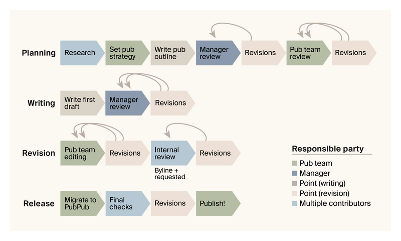 While we had lighter tracks for pubs and contributors with different needs, this had become our default approach. The complexity and number of hand-offs make coordinating a process like this time-intensive, even if the individual tasks are straightforward. Not included but formerly part of our default process were code review, figure development, IP check, and engagement strategy.
