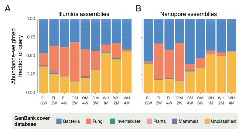 We compared our assembled contigs to several “cover databases” (simplified databases that contain each k-mer only once) and used the R package sourmashconsumr to depict the proportion of sequences that sourmash could classify in each database or that remain unclassified for (A) Illumina or (B) Nanopore assemblies. X-axis labels are abbreviated cheese sample names and aging durations (W = week; M = month).