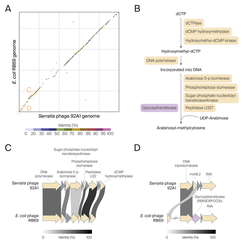 (B) Pathway for hypermodification of hydroxymethylcytosine with arabinose, and the enzymes involved in each step. Genes that are conserved in RB69 and Serratia phage 92A1 are in yellow. A glycosyltransferase (purple) is necessary to complete the modification, but the candidate transferase in RB69 is not conserved in Serratia phage 92A1.