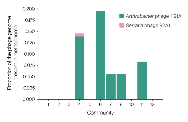 We were surprised to find that Serratia phage 92A1 only had matches in comm_4, the community we originally isolated it from (Figure 5). In comparison, Arthrobacter phage 1191A had matches in comm_7, the community we isolated it from, as well as communities 4, 6, 8, and 11. We were also surprised to see that Serratia phage 92A1 was at extremely low abundance in comm_4. Read-mapping of comm_4 metagenome against the Serratia phage 92A1 genome revealed that only 17 out of 27,761,010 read pairs concordantly mapped to Serratia phage 92A1. This is an extremely low signal, and means that without isolation and sequencing of the phage genome, we likely would not have detected Serratia phage 92A1 in the community.