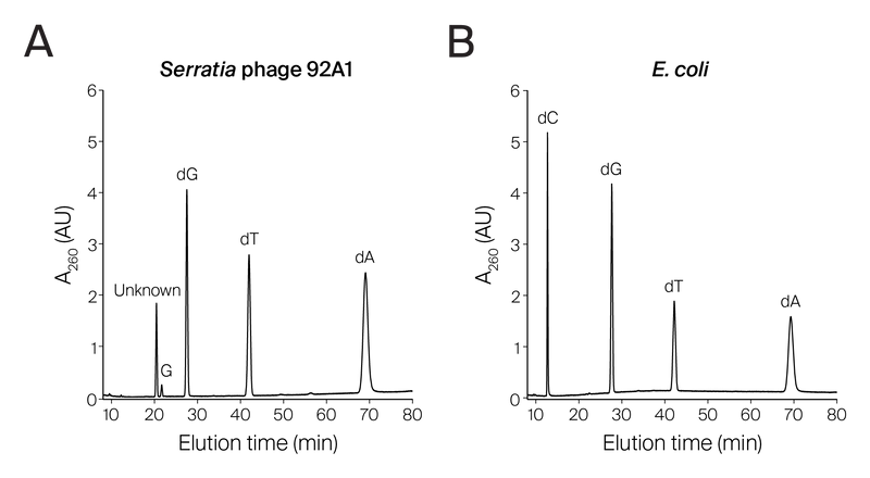 (A) HPLC trace of Serratia phage 92A1 nucleosides.