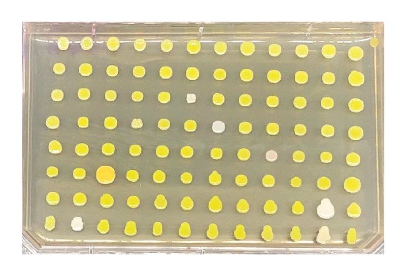 A pinned 96-well plate of isolates from high-throughput isolation of WH 2M Hous community. A single morphology of smooth, opaque, and greenish-yellow colonies dominated this isolation effort. These characteristics are consistent with Brachybacterium, which is present but does not make up a large proportion of the WH cheese communities.