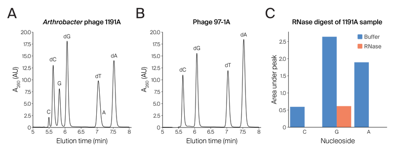 We digested 1 µg of phage DNA with RNase A at a final concentration of 10 µg/mL at 25 °C for 2 h, in the presence of 10 mM EDTA. We prepared an RNase A-minus control reaction in parallel. These two samples underwent column cleanup using the Zymo DNA Clean and Concentrator kit (D4033) to remove digested nucleosides. We recovered ~500 ng of DNA for each sample in a volume of 25 µl. We then analyzed these samples via HPLC with a 60-minute run to assess their nucleoside content.