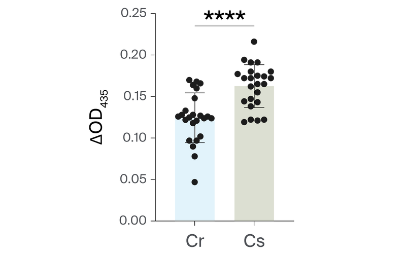 Individual values represent the 24 individual treatments after subtracting the mean of 12 individual untreated controls. Cr = C. reinhardtii; Cs = C. smithii. Error bars depict standard deviation. We compared treatments using an independent t-test (t = 4.716, df = 46, p < 0.0001). Asterisks indicate a significantly different p-value: ****p < 0.0001.