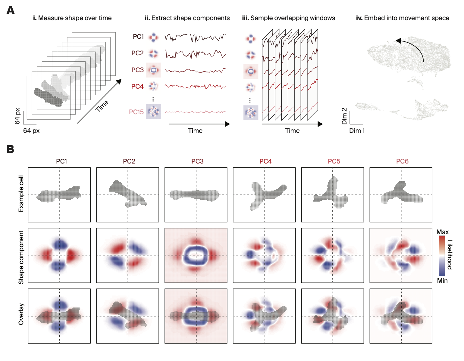 (Aii) Example shape components for a single cell and their values over time. Each component (PC1…15) is shown with its associated 2D eigenvector (blue = negative values; red = positive values).