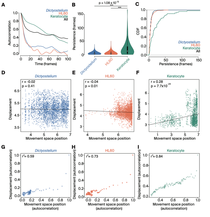 This continuum was even more present when factoring in temporal variation (in the form of the autocorrelation of movement space position and displacement). One can conceptualize this relationship as representing the dynamic relationship between cell shape and movement. Cases in which the two are tightly related indicate a narrow bandwidth of possible cell shape dynamics that are able to produce movement. On the other hand, cases in which the two distributions are less related reflect scenarios in which cell shape is able to vary more independently of movement. Here, as above, we found a continuum of these types of relationships. Dictyostelium possessed relatively less of a connection between temporal variation in structure-function (r2 = 0.59; Figure 4, G), HL60 was in the middle (r2 = 0.73; Figure 4, H), and keratocytes displayed a strong relationship between the two (r2 = 0.84; Figure 4, I). These results suggest that variation in the temporal structure of movement is coupled with distinct structure-function relationships. Furthermore, this finding is notable in that it ties analyses of cellular motility with discrete structural properties that have well-described biological mechanisms (e.g. cytoskeletal remodeling and adhesion genes), providing a potential framework for the high-throughput association of molecular dynamics with complex morphological and movement phenotypes.