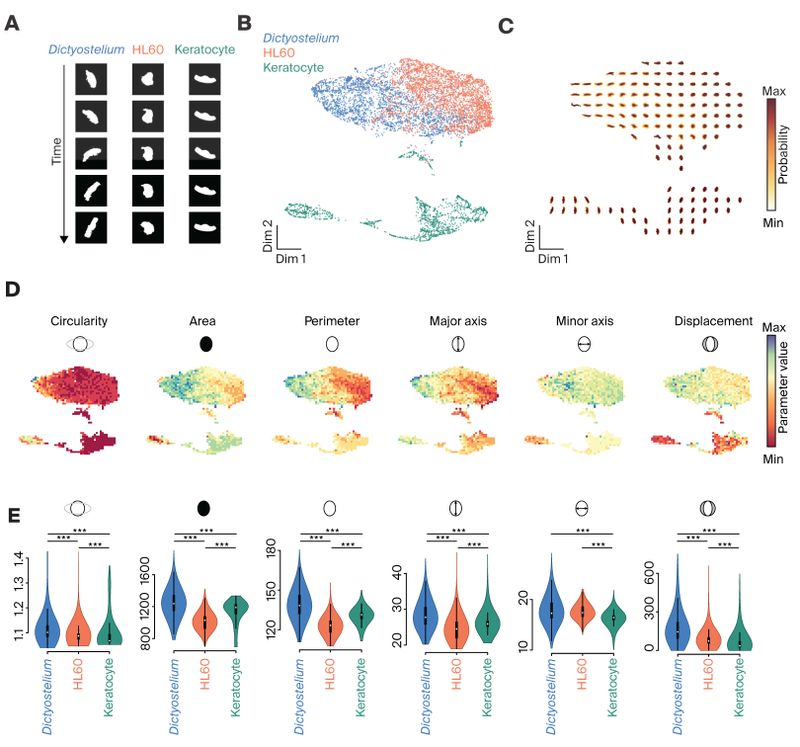 We next used the 2D “map” of behavior generated above to assess the overall distributions of movement patterns for the three cell types in the dataset: Dictyostelium, HL60, and keratoctyes (Figure 2, A). We found that each cell type was associated with a specific region of the map (Figure 2, B) and these regions were associated with specific cell shapes (Figure 2, C; Video 1). At first glance, it’s clear that these shapes reflected differences in morphology possessed by the three cell types (Figure 2, A). However, they also differed in the amount of variation around the mean cell shape. For example, Dictyostelium cells appeared to possess greater diversity in cell shape (reflected by the “fuzziness” of the mean cell images) compared to keratoctyes (Figure 2, C). This suggests that, not only are these cell types identifiable by movement differences, but that each may possess unique qualities in the patterning and complexity of their movements.