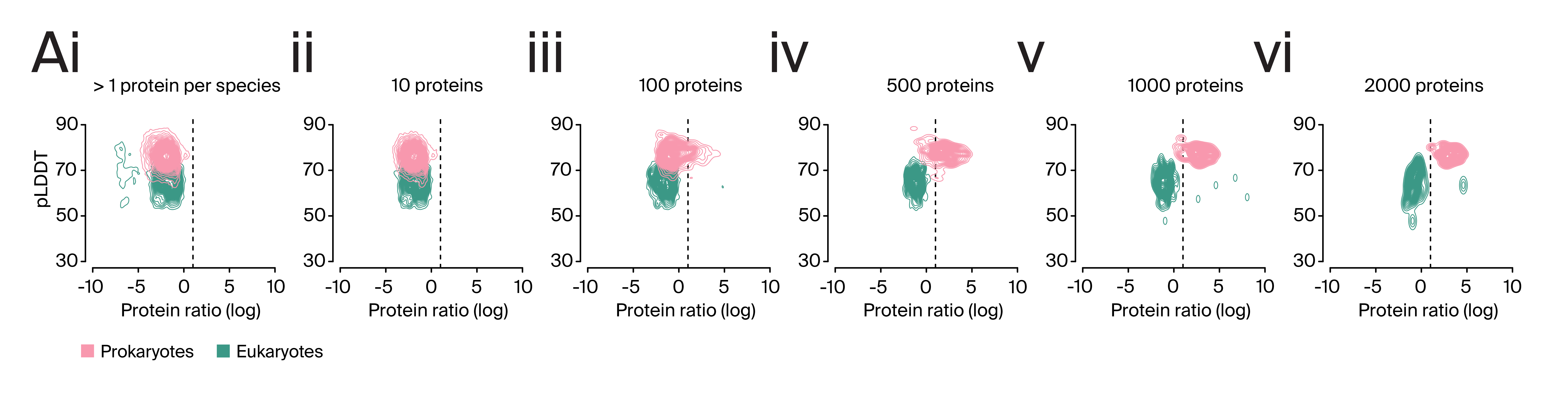 Contour plot comparing protein ratio (logarithm of the proportion of proteins in the AFDB and proteins in proteome) and mean pLDDT of individual species calculated over a range of cutoffs (from > 1 protein (i) to 2,000 proteins (vi).