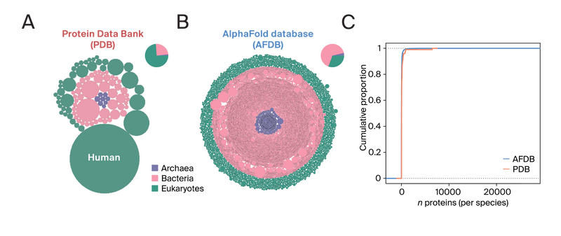 We first wanted to understand the basic taxonomic makeup of the known protein universe. A straightforward approach to this is to measure the number of protein structures in the database that are contributed by each species. Visual inspection demonstrated that, in both the Protein Data Bank (PDB) and AlphaFold database (AFDB), a small number of species represented orders of magnitude more proteins than all others (Figure 1, A–B). In the PDB, these structures were dominated by eukaryotic samples (likely owing to the bias toward solving human protein structures) (Figure 1, A), while the AFDB was weighted toward prokaryotes (likely owing to the bias toward sequence bacterial genomes) (Figure 1, B). Despite domain-level differences, both databases were associated with strongly left-shifted cumulative distributions, indicating that a significant proportion of their proteins come from a very small number of species (Figure 1, C). Gross taxonomic biases in species sampling therefore exist in the PDB and AFDB (this has also been noted about UniProt and other databases [14]).