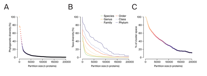 The specific effects of filtering were assessed by calculating Faith’s phylogenetic diversity (using clade_PD) of species contributing at least n proteins to the AFDB over a range of minimum values (from 0 to 20,000 proteins). The distribution of these measurements is presented in Figure 5, A. Taxa diversity was also assessed at each cutoff by calculating the proportion of taxa left as a function of the total number for each level of the taxonomic hierarchy (as in Figure 5, B). The percent of cluster space was calculated by identifying all the number of unique clusters represented at each cutoff, divided by the total number of Foldseek clusters (as in Figure 5, C).