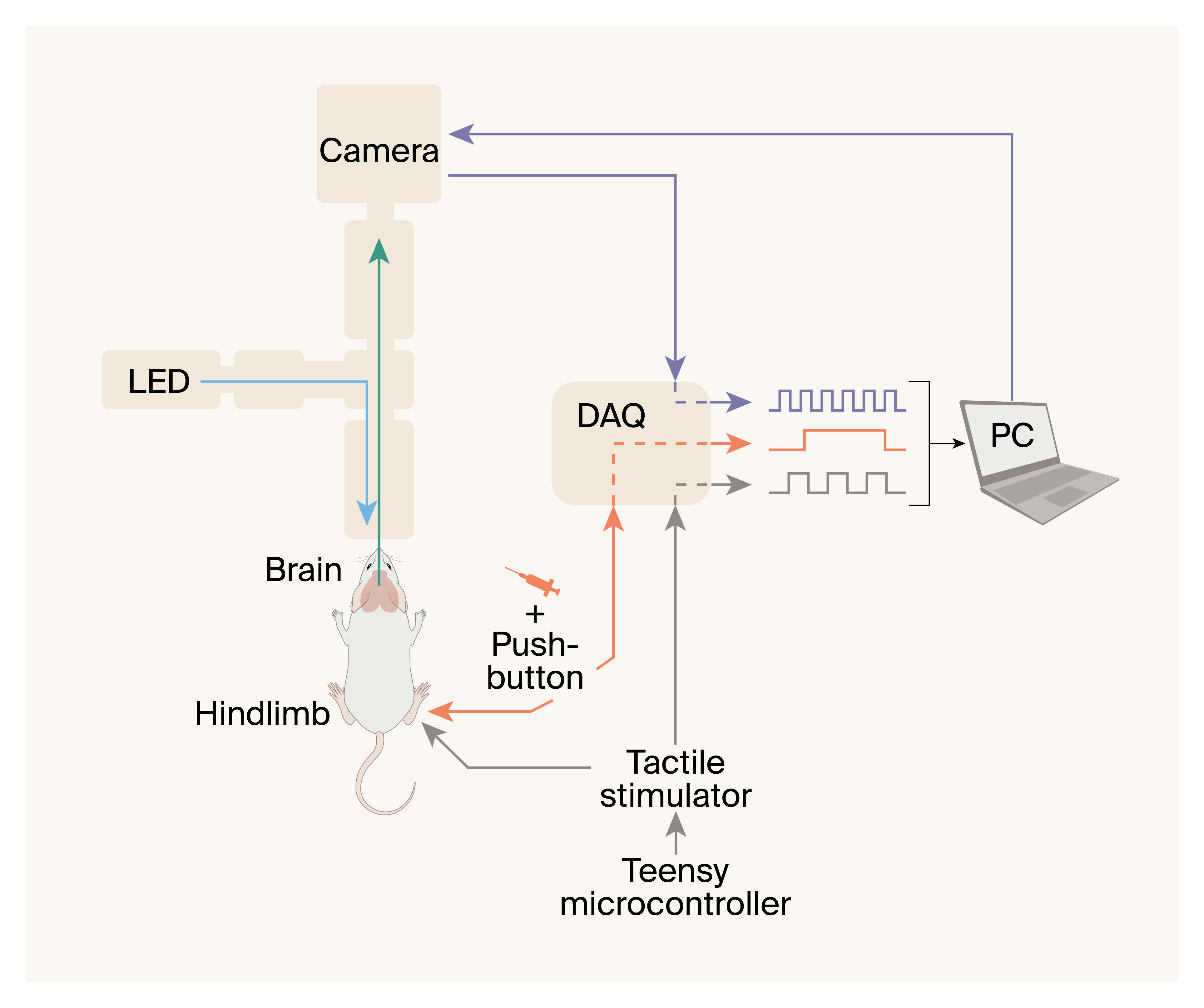 The microscope consists of a blue LED for autofluorescence excitation, a camera for capturing brain activity, and additional mirrors, filters, and lenses (not pictured). The Teensy microcontroller drives the stimulator that’s used to deliver tactile stimuli. The PC controls the camera, the Teensy microcontroller, and the data acquisition system (DAQ). The microcontroller runs a small program to control the LED and tactile stimulator. The DAQ captures signals from the camera, tactile stimulator, and injection push-button to synchronize the sensory stimulation and imaging data.
