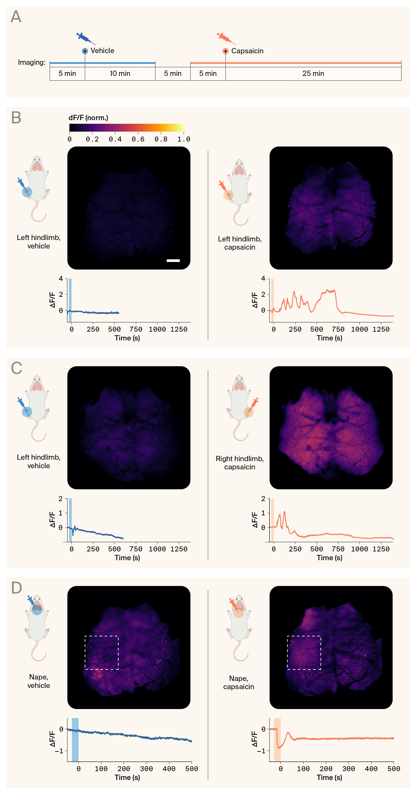(A) Experimental setup. We injected a mouse with vehicle and/or capsaicin into the left hindlimb, right hindlimb, or the nape of the neck 5 minutes after beginning the imaging trial. We imaged the vehicle trials for 15 min and the capsaicin trials for 30 min.
