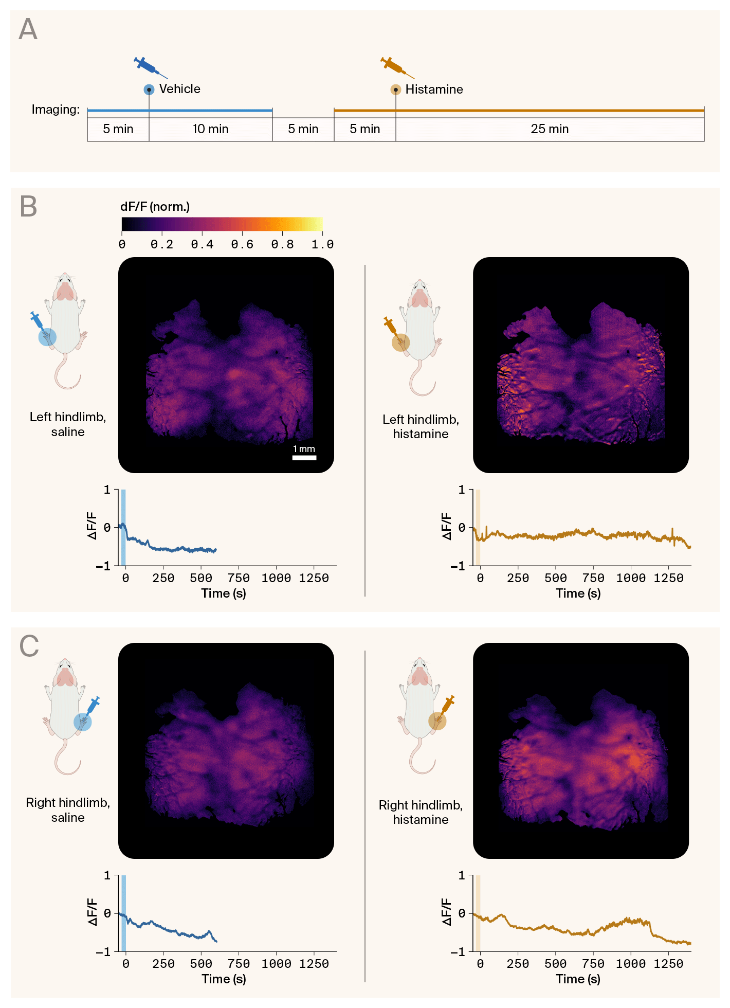 (B) Results of saline (left) and histamine (right) injections into the left hindlimb of a mouse (N = 1).