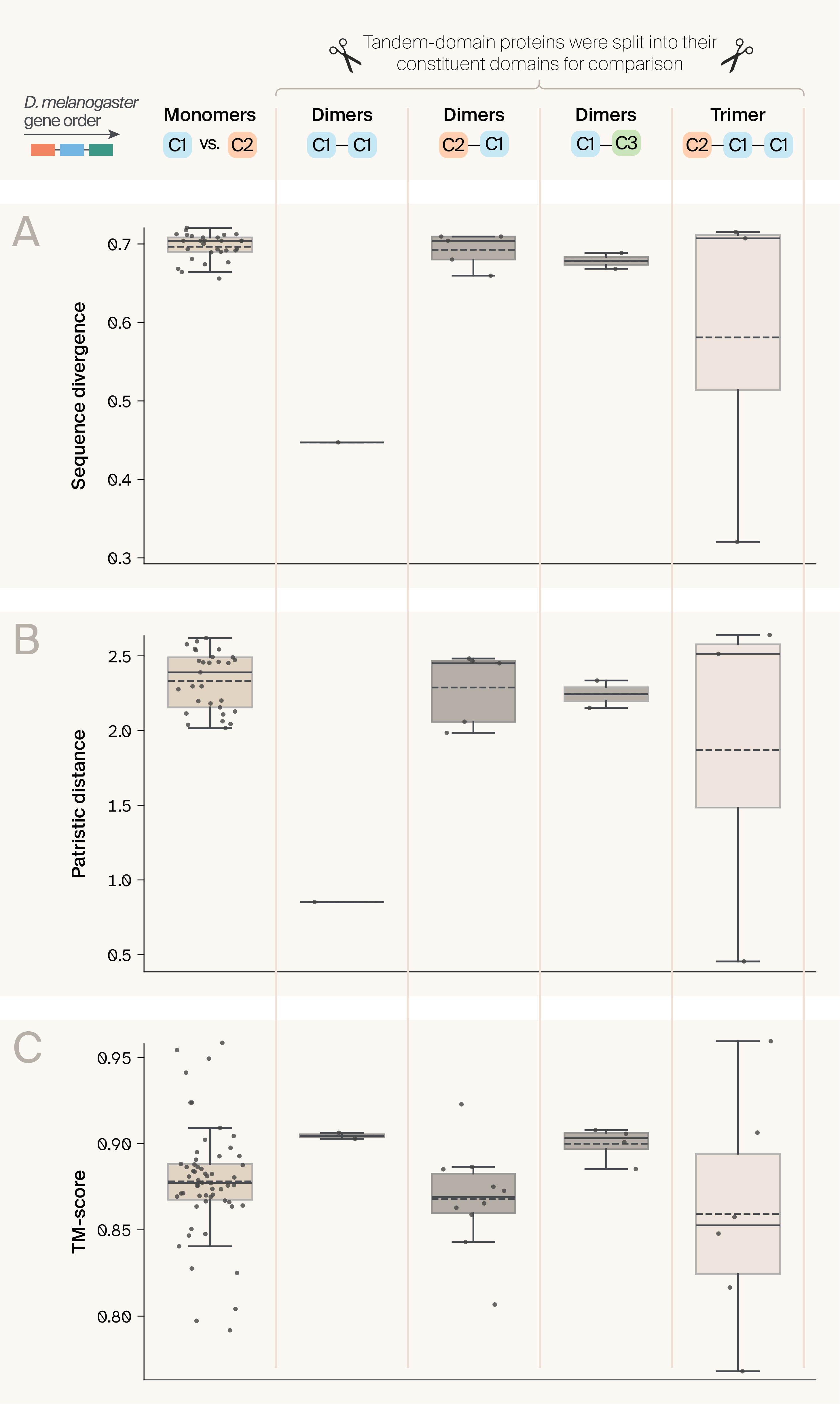 Patterns of intra-specific pairwise (A) sequence divergence, (B) patristic distance, and (C) TM-scores are similar between single-domain proteins present in our dataset (leftmost box; pairwise comparisons for each Drosophila species with a protein in Cluster 1 and a protein in Cluster 2), and tandem-domain proteins we split into their constituent domains (four rightmost boxes). For each box, the top and bottom of the box represent the bounds of the interquartile range, the solid line represents the median value, the dashed line represents the mean value, and the whiskers extend to 1.5 times the interquartile range beyond the box.