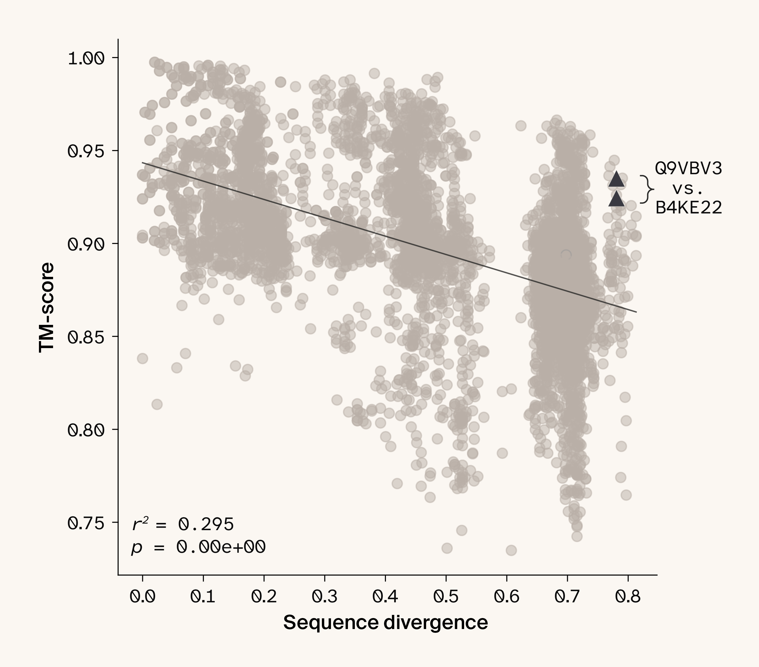 Plotting all pairwise comparisons of protein domains in our dataset shows that as sequence divergence increases, protein structural similarity decreases, albeit only minimally (Pearson correlation r2 = 0.295, p < 0.001). The two reference proteins highlighted by Wu et al. 6 are indicated with triangles. Since TM-score is directional, each pairwise comparison has two associated points.