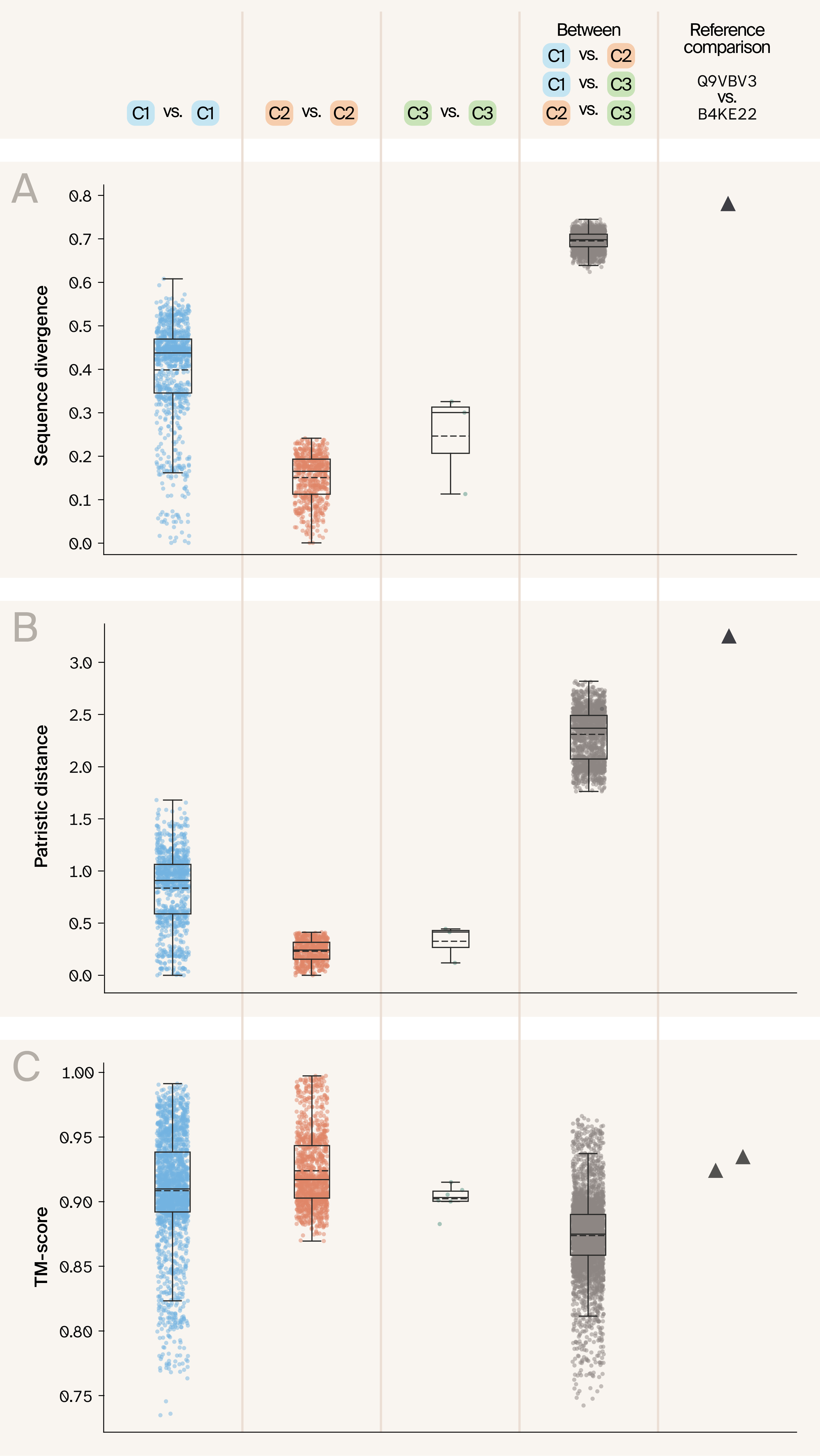 To test the relationships between sequence divergence, patristic distances, and TM-scores, we calculated Pearson correlations between all combinations of the three metrics using pearsonr from SciPy (v1.17 19) and carried out linear regression using np.polyfit from NumPy (v2.4.2 20). Pearson r2 and p-values were reported for each, and the relationship between sequence divergence and TM-score was plotted using matplotlib (v3.10.8 21). We also produced boxplots using matplotlib (v3.10.8) to illustrate the variation in these three statistics. First, to compare within-cluster variation in sequence divergence, patristic distances, and TM-scores, we extracted pairwise comparisons from our dataframe that were between two proteins in Cluster 1, two proteins in Cluster 2, two proteins in Cluster 3, and then all between-cluster pairwise comparisons, and plotted these alongside the comparisons representing the reference sequences Q9VBV3 and B4KE22. To help elucidate whether our tandem-domain sub-domains looked similar or different to those genes annotated and folded separately, we also compared sequence divergence, patristic distances, and TM-scores. This time, we identified pairwise comparisons in which a given species had separately annotated proteins in Cluster 1 and Cluster 2, and compared statistics between those, and the subdomains of different split tandem dimers, and the tandem trimer (separating the three types of dimers — C1–C1, C2–C1, and C1–C3).