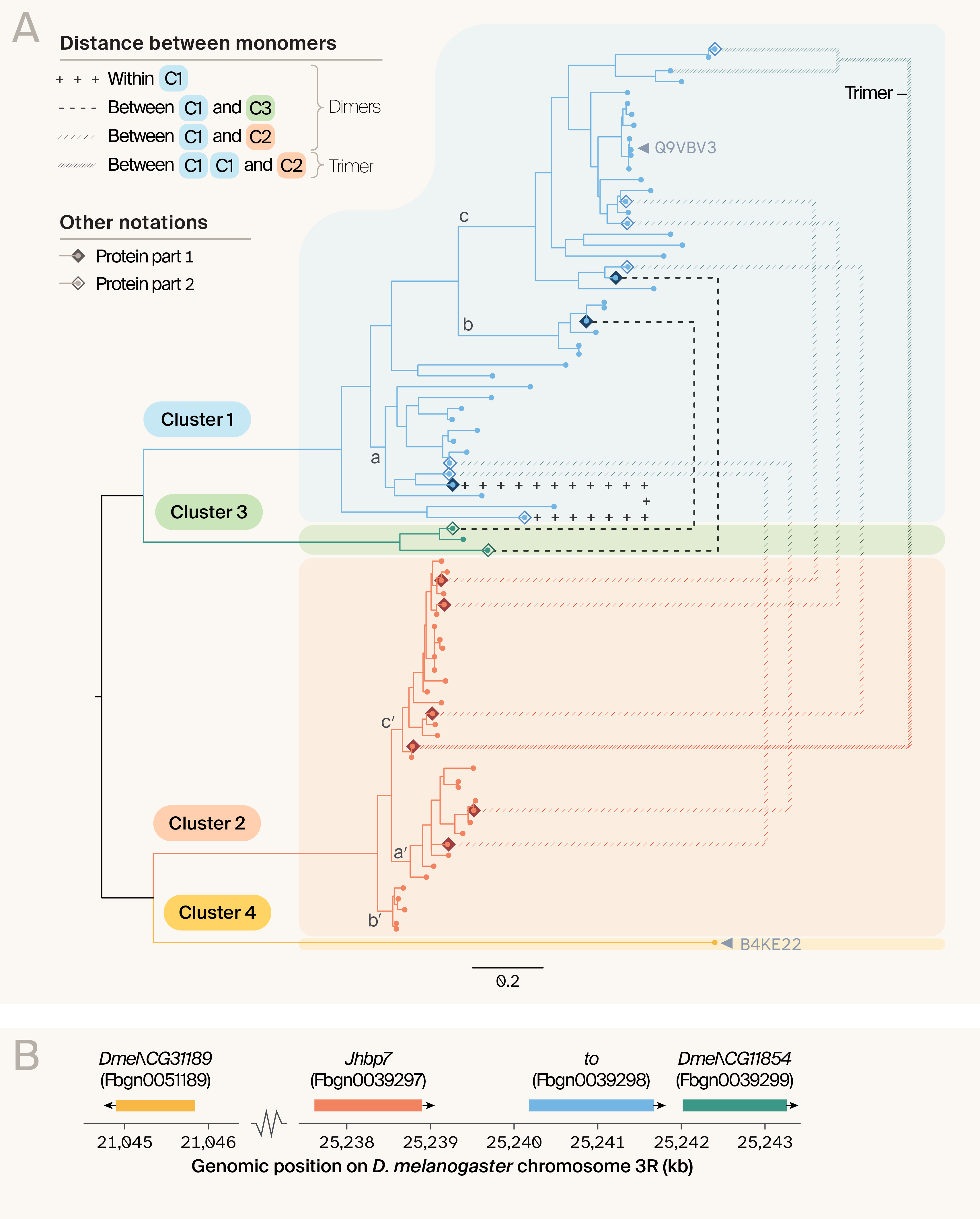 - A tandem dimer linking one Jhbp7 domain (Cluster 2) to a Takeout domain (Cluster 1) Jhbp7-Takeout/C2–C1 dimers; observed five times; /// line in Figure 2, A), observed across even distantly related Drosophila species, including D. takahashii, D. subpulchrella, D. bipectinata, D. arizonae, and D. innubila.