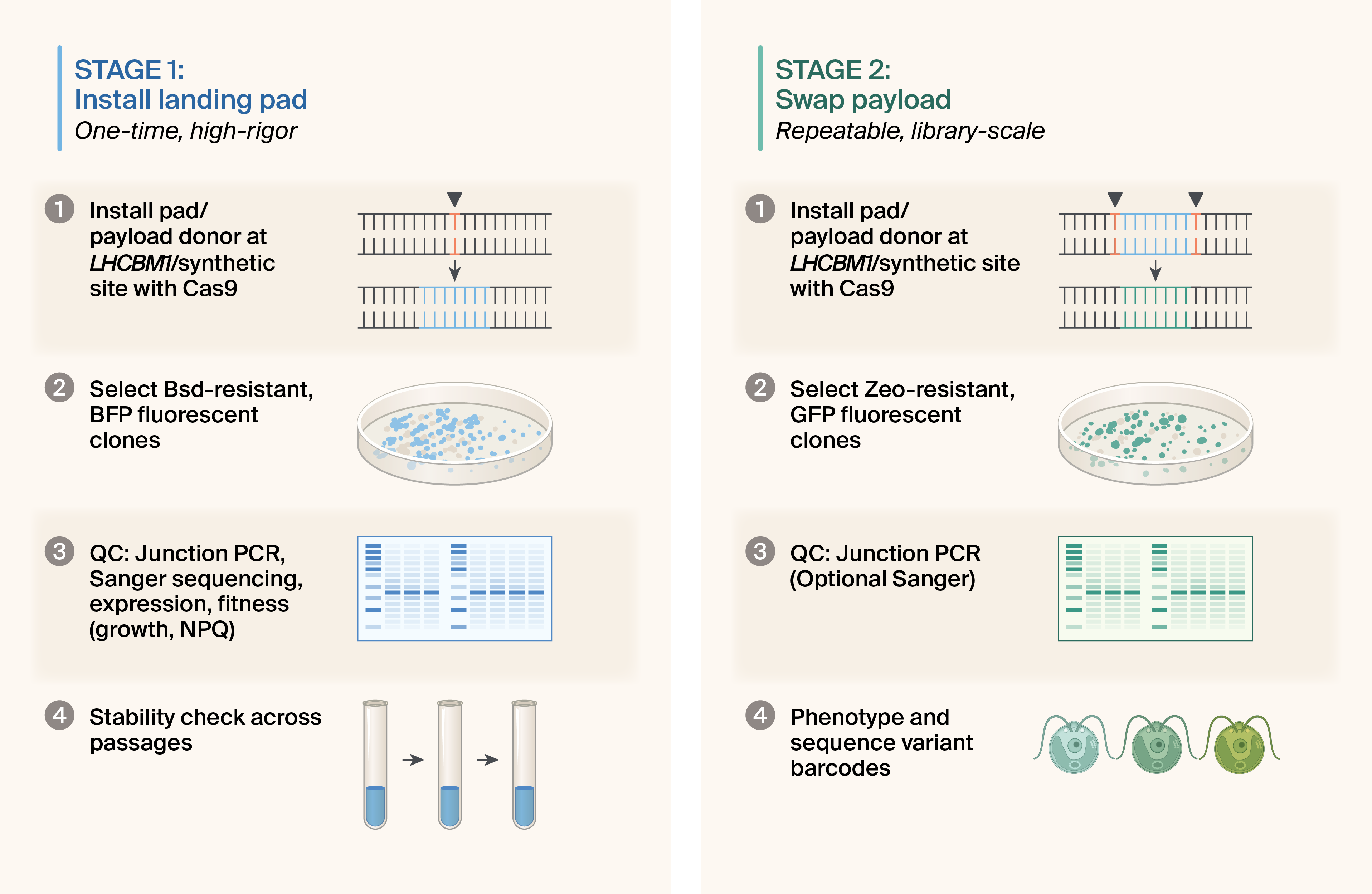 Stage 1 (left): One-time installation and validation of the landing pad at the LHCBM1 safe-harbor locus in a srta-attenuated CC-124 background. Following Cas9-mediated HDR insertion, candidate lines undergo high-rigor quality control, including verification of stuffer cassette function (BFP fluorescence and blasticidin resistance), left and right junction PCR and Sanger sequencing, growth and photophysiology assays, and extended passaging to confirm long-term expression stability. Lines that meet all criteria are banked as reusable chassis strains.