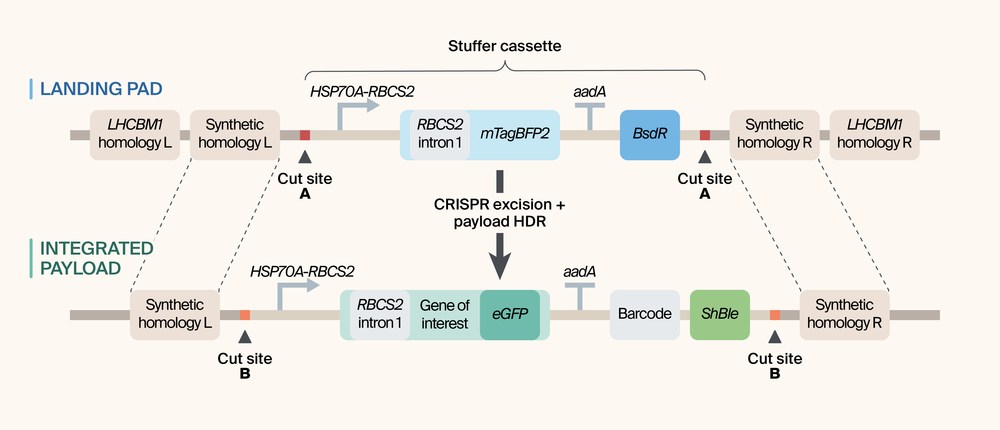 (Top) Genomically integrated landing pad showing LHCBM1-flanking homology arms, synthetic CRISPR cut sites (protospacer–PAM modules), and a removable stuffer cassette.