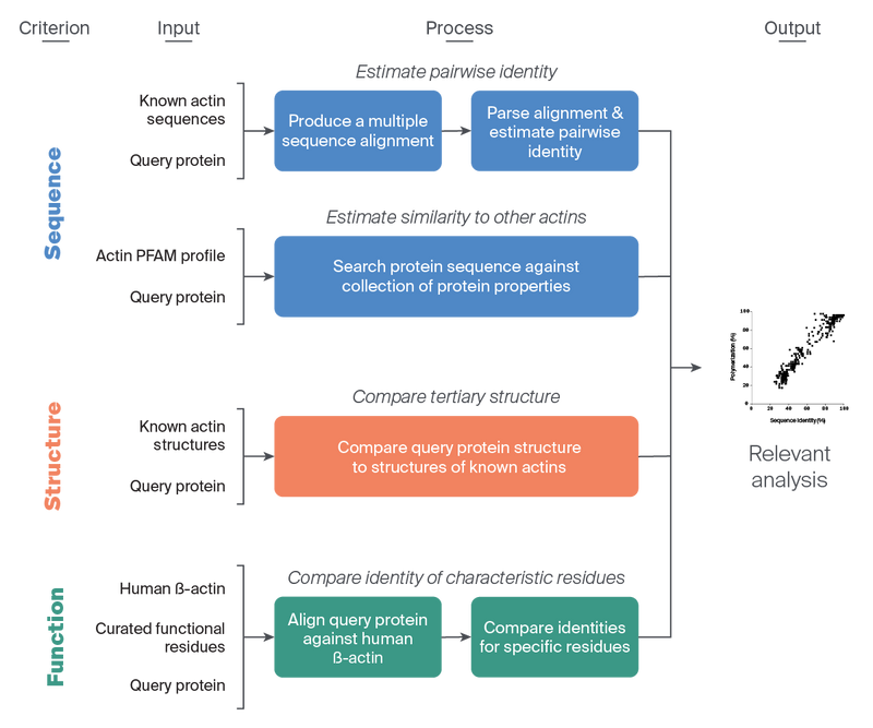Using the three criteria above and each step described below, we created a streamlined and efficient pipeline that tells us the likelihood that a protein of interest is a true actin. While other tools allowed us to look at global sequence identity or structural identity independently, this pipeline considers sequence and structural identity together as well as important functional properties and their conservation (Figure 1).