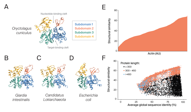 This “actin fold” is critical because in order to perform its cellular functions, actin must be able to polymerize, perform its ATPase functions, and interact with a large range of actin-binding proteins. Due to its functional importance across organisms, the overall structure of actin is well-conserved. A similar fold can be found in actins from humans to the distant eukaryote Giardia, but also in archaea and bacteria (Figure 3, A–D). This characteristic actin fold is also shared by non-actin proteins, including some actin-related proteins, sugar kinases, hexokinase, and Hsp70 proteins [16]. This highlights the importance of considering multiple criteria in determining whether a protein is indeed an actin.