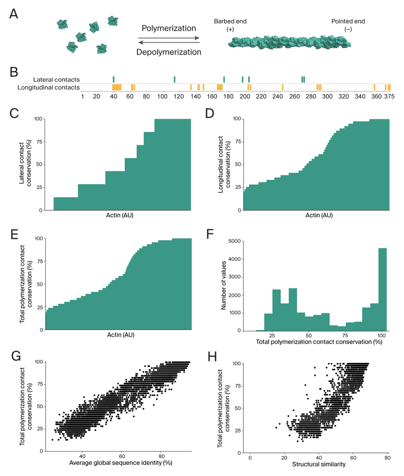We ran our candidate actins through this program and got results for 20,095 candidate actins that had non-gapped alignments to our reference human ß-actin. In a subsequent version, we plan to adjust the pipeline to include alignments with gaps as well. Here, we found that there is a broad range of conservation of these residues for both lateral contacts and longitudinal contacts (Figure 4, C–D). Putting these contacts together, we saw a clear transition between a group of query actins that are more conserved and a group that is less conserved (Figure 4, E–F). We also looked at polymerizability compared to both sequence identity (Figure 4, G) and structural conservation (Figure 4, H). We found that in both cases, there is a correlation between the percentage of conserved residues involved in polymerization and each of the other two criteria.
