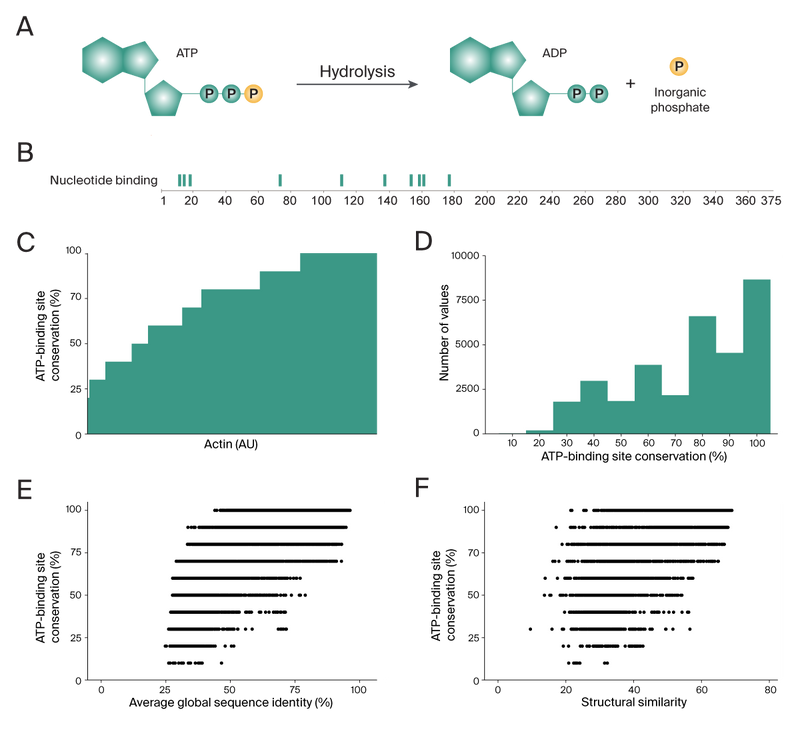We aligned each of query sequences to that of human ß-actin and annotated the regions that have been found to be involved in ATP binding and therefore ATPase function. We analyzed 32,680 of our original candidate actins that had non-gapped alignments to our reference human ß-actin to our reference human ß-actin and found that overall, the ability to bind ATP seems to be more conserved than the ability to polymerize (Figure 5, C–F). Even some proteins with relatively low percent global identity or structural similarity still seem likely to bind ATP based on the conservation of the residues involved (Figure 5, E–F). However, there are cases where these residues are not well-conserved. These might be interesting targets for better understanding how actin functions as an ATPase and how those functions evolved.