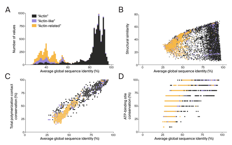 Generally, a protein’s global sequence identity to a known protein is used to determine its divergence or similarity to other proteins. The amino acid sequence, or the primary structure, helps determine how the protein will assemble into its secondary structure. It is also important for interacting with other proteins, with other monomers in the case of actin, and with other molecules in the cell, like ions and small molecules. Thus, looking at the global sequence similarity can be a useful metric. However, this metric alone ignores other ways in which proteins can be similar resulting in likely misses of proteins that may be related. It could also give rise to spurious relationships between proteins that have actin-like sequences but do not function like actin.