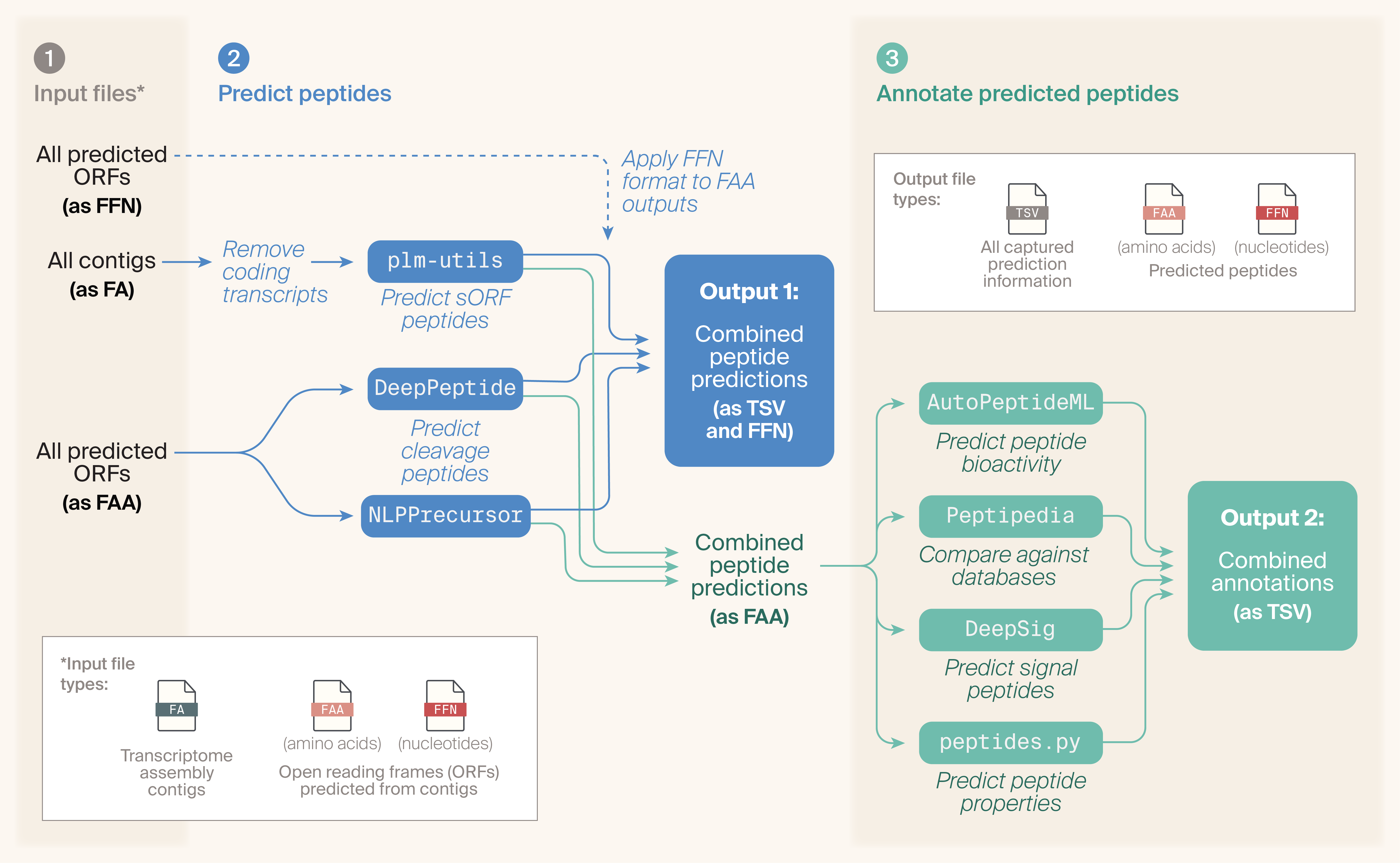We introduce peptigate, a workflow that applies previously developed best-in-class tools to predict and annotate diverse bioactive peptides from transcriptomes (Figure 1). “Peptigate” is a portmanteau of peptide and investigate. Peptigate currently predicts sORF-encoded proteins, cleavage peptides, and ribosomally synthesized and post-translationally modified peptides (RiPPs). These peptides are then annotated to predict bioactivity, chemical properties, similarity to known peptide sequences, and the presence of a signal peptide. These functions were previously scattered in disparate tools; peptigate unites them to make diverse peptide prediction simpler.